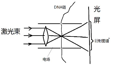 測序流程:合成一段已知序列的單鏈DNA,要求含有全部A G C T四種核苷酸。在脈沖電場作用下,這段已知序列的帶負(fù)電的DNA單鏈被拉直并一堿基一堿基的通過納米孔,每通過一個堿基便會出現(xiàn)數(shù)微秒的停頓。低能超細(xì)高頻激光束經(jīng)過聚焦,在焦點(diǎn)處與剛剛經(jīng)過納米孔的DNA單鏈相遇,經(jīng)過衍射,在另一側(cè)的光屏上形成衍射圖譜,由于DNA單鏈的間續(xù)性運(yùn)動,會產(chǎn)生間續(xù)性衍射圖譜,以衍射圖譜與DNA序列作對比,可以得出每種圖譜對應(yīng)的堿基。