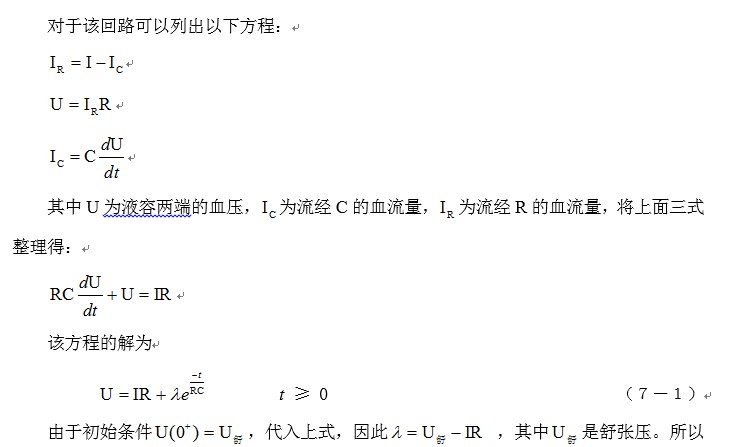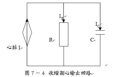 下圖是心臟收縮期回路簡單模擬,血管的狀態(tài)用R和C簡單并聯(lián)表示。由于血管各處都存在液容,實際的情況可能很復雜,但用簡單參數(shù)分析,也同樣能反映血液循環(huán)的一些特性。為了分析的方便,將心臟射血輸出量近似為恒流源。