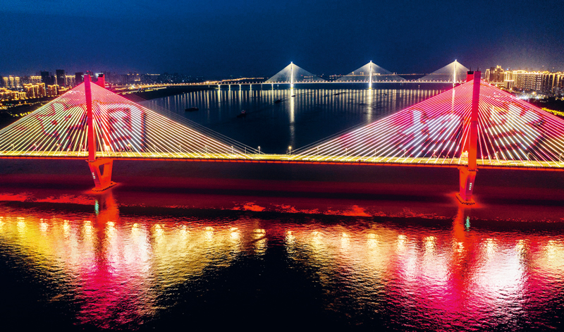 在抗擊新冠肺炎疫情的斗爭(zhēng)中,中國(guó)人民萬眾一心、眾志成城,凝聚起強(qiáng)大合力,展現(xiàn)了中國(guó)力量、中國(guó)精神、中國(guó)效率。圖為2020年5月2日晚,湖北武漢長(zhǎng)江二橋燈光秀打出的“中國(guó)擔(dān)當(dāng)”畫面。 中新社發(fā) 趙廣亮/攝