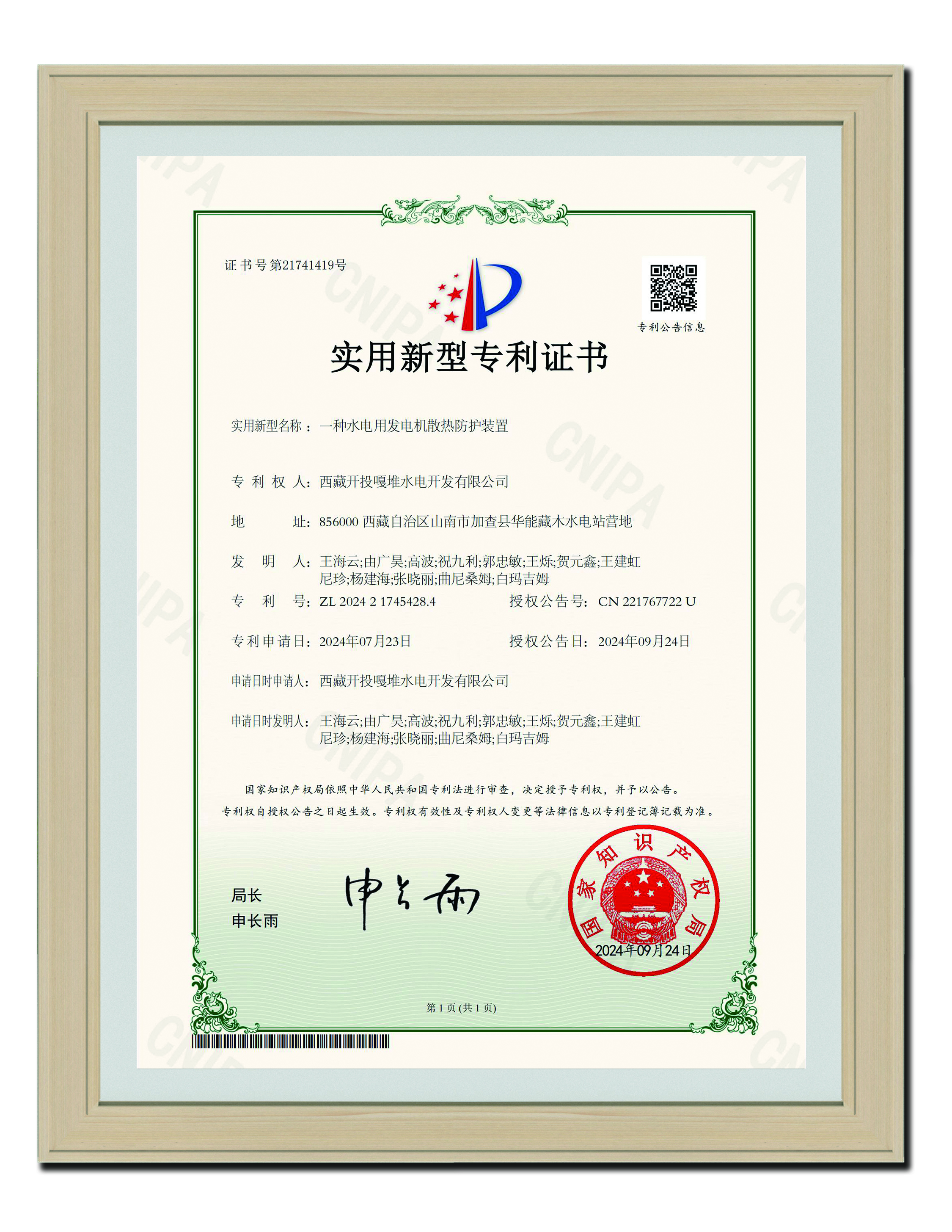 2024-09-24 實(shí)用新型專利證書_一種水電用發(fā)電機(jī)散熱防護(hù)裝置