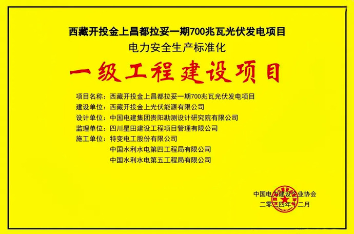 西藏開投金上拉妥一期700MW光伏發(fā)電項(xiàng)目于2021年12月13日取得備案批復(fù)文件,2024年12月底主體工程建設(shè)完成,具備并網(wǎng)發(fā)電條件,并于當(dāng)年12月順利通過電力建設(shè)工程安全生產(chǎn)標(biāo)準(zhǔn)化一級(jí)評(píng)審,榮獲中國電力建設(shè)企業(yè)協(xié)會(huì)頒發(fā)的“電力安全生產(chǎn)標(biāo)準(zhǔn)化一級(jí)工程建設(shè)項(xiàng)目”榮譽(yù)。
