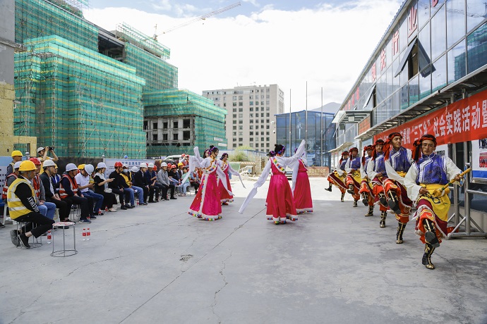 在能源基地項目現(xiàn)場,青春洋溢的大學(xué)生隊員們以特色舞蹈展現(xiàn)了西藏地方文化。西藏大學(xué)帶隊老師向工人代表贈送了應(yīng)急處置知識包,并向參建工人普及日常應(yīng)急知識。隨后,師生們在集團(tuán)公司安全監(jiān)管人員的帶領(lǐng)下,參觀了能源基地項目。