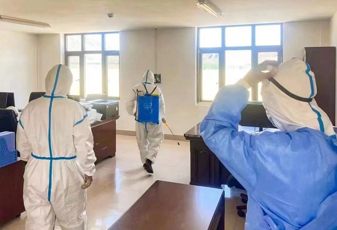 (辦公區(qū)域消毒 王呈云攝)