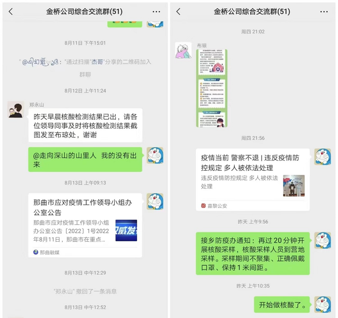 付少龍通過微信工作群及時將區(qū)、市、縣、公司疫情防控工作決策部署、防控政策措施、疫情防控違法違規(guī)行為等傳達給全體員工,引導員工做好自身防護的同時,做到不信謠、不傳謠、不恐慌、不松懈。