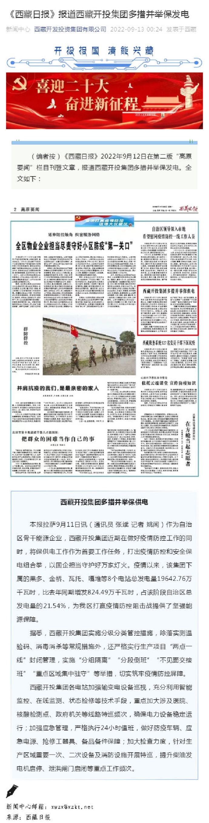 【西藏日報(bào)】報(bào)道西藏開投集團(tuán)多措并舉保發(fā)電