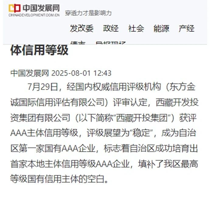 近期,中國發(fā)展網(wǎng)、西藏日?qǐng)?bào)客戶端、西藏商報(bào)等媒體聚焦報(bào)道西藏開發(fā)投資集團(tuán)有限公司獲評(píng)AAA主體信用等級(jí)消息。7月29日,經(jīng)國內(nèi)權(quán)威信用評(píng)級(jí)機(jī)構(gòu)(東方金誠國際信用評(píng)估有限公司)評(píng)審認(rèn)定,西藏開發(fā)投資集團(tuán)有限公司獲評(píng)AAA主體信用等級(jí),評(píng)級(jí)展望為“穩(wěn)定”,成為自治區(qū)第一家國有AAA企業(yè),標(biāo)志著自治區(qū)成功培育出首家本地主體信用等級(jí)AAA企業(yè),填補(bǔ)了我區(qū)最高等級(jí)國有信用主體的空白。