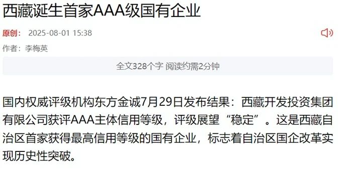 媒體報(bào)道丨西藏誕生首家AAA級(jí)國有企業(yè)