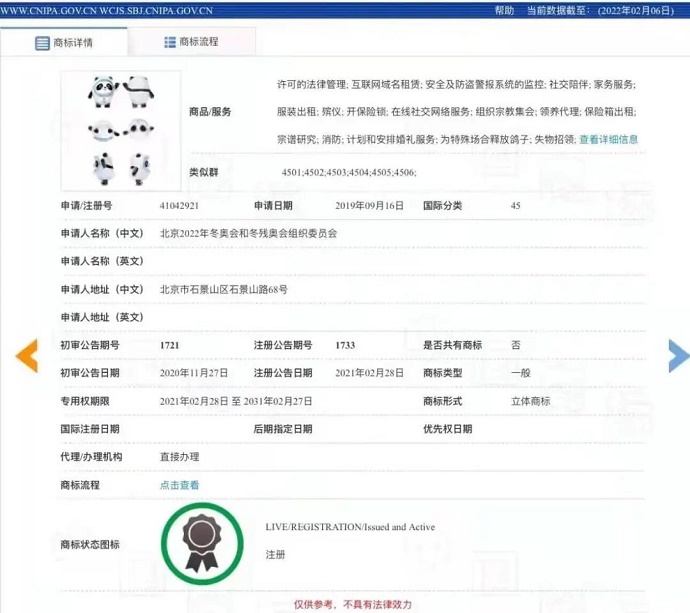 北京冬奧就中英文名稱“冰墩墩”“Bing Dwen Dwen”及其三維標志在全部45個類別的商標于2020年獲準注冊。