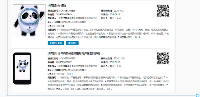 2019年9月,北京冬奧組委向國家知識產(chǎn)權(quán)局提交了4件與冰墩墩相關(guān)的外觀設(shè)計專利,并于2020年獲得授權(quán)。