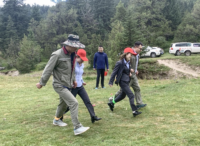 座談結(jié)束后,全體黨員面向黨旗莊嚴(yán)宣誓,重溫入黨誓詞,激勵永葆入黨初心。最后,兩支部開展了以“重溫紅色”為主題的戶外團建活動,通過重走長征路、黨建知識問答、紅色詞匯你比我猜、兩人三足等活動進一步增進支部交流互動。活動現(xiàn)場,參賽隊員充分發(fā)揚團隊精神,積極參與,精誠合作,加油聲、吶喊聲、歡呼聲此起彼伏。
