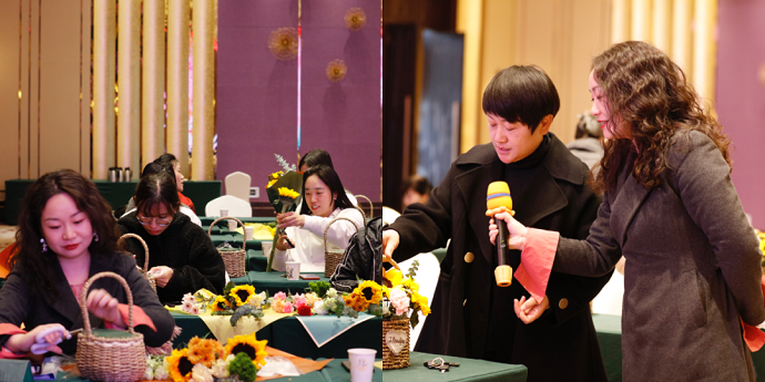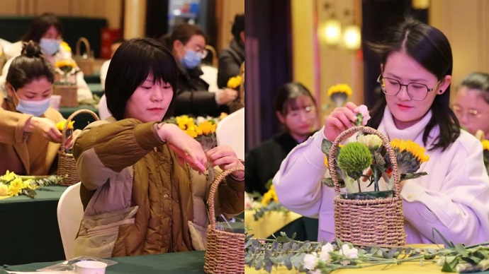 活動特邀專業(yè)花藝師為女職工們科普花卉養(yǎng)護、理論花藝色彩學以及中式插花和西式插花的區(qū)別等方面知識?;顒又校鬓k方為大家精心準備了各種鮮花,在花藝師的指導下,女職工們經(jīng)過精心巧妙的構(gòu)思、修剪、整枝和裝飾,創(chuàng)作出一件件精美的藝術(shù)品。