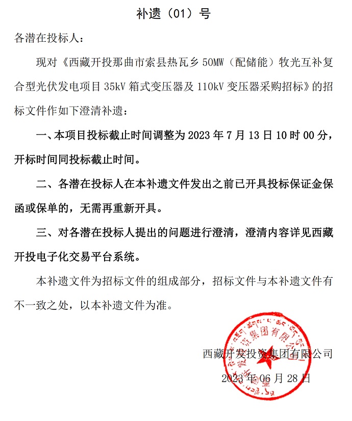 西藏開投那曲市索縣熱瓦鄉(xiāng)50MW(配儲能)牧光互補(bǔ)復(fù)合型光伏發(fā)電項目35kV箱式變壓器及110kV變壓器采購招標(biāo)