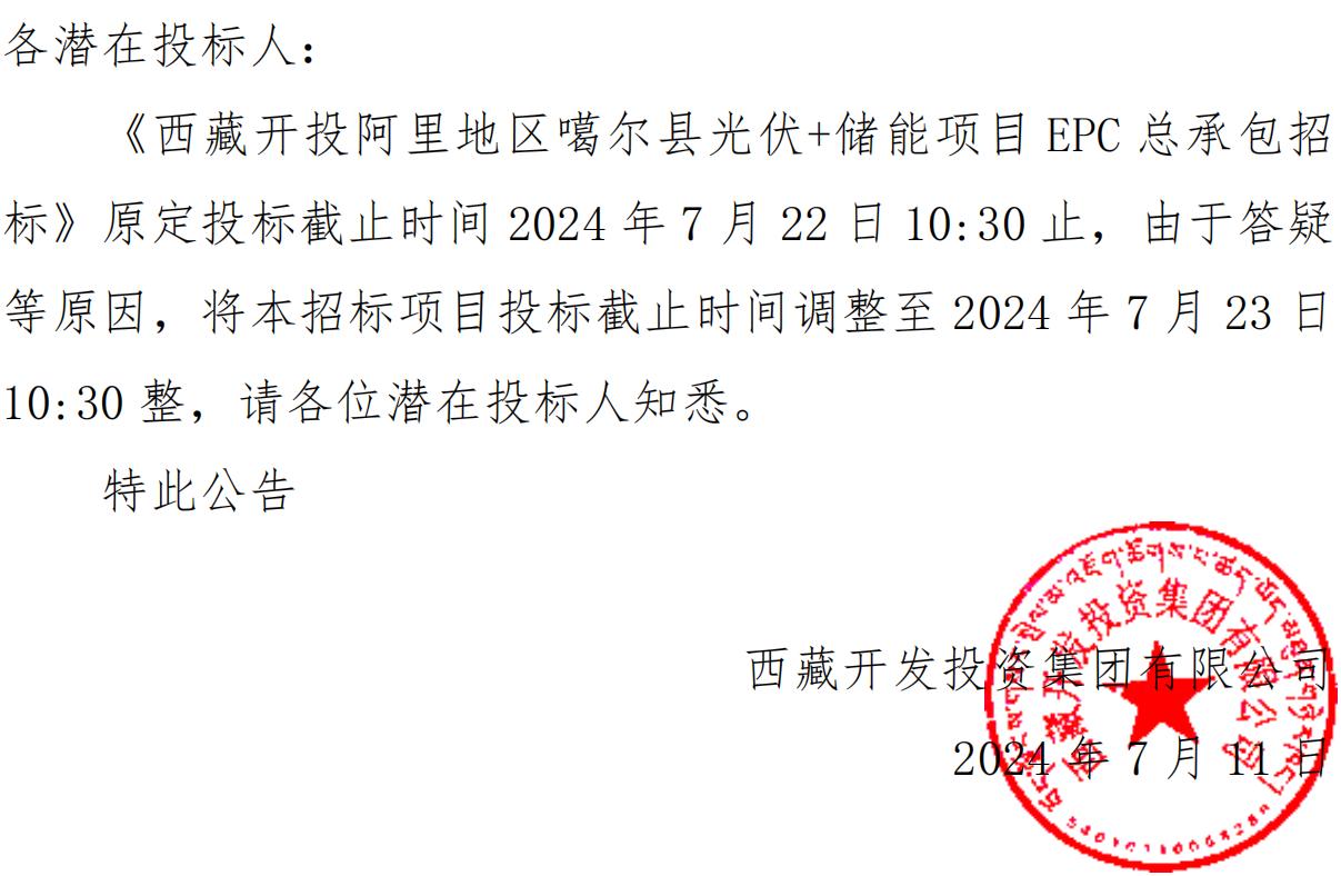 關(guān)于延長《西藏開投阿里地區(qū)噶爾縣光伏+儲能項(xiàng)目EPC總承包招標(biāo)》投標(biāo)截止時(shí)間的公告