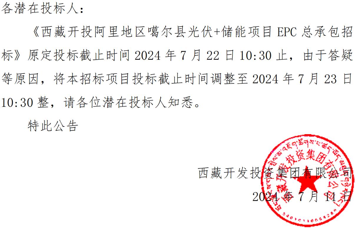 關(guān)于延長《西藏開投阿里地區(qū)噶爾縣光伏+儲 能項(xiàng)目 EPC 總承包招標(biāo)》投標(biāo)截止時間的公告